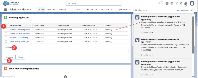 Example in Practice: Your approval queue fills up with multiple opportunity approvals each day, and reviewing them one by one is time-consuming. A developer creates a custom component that displays all pending approval requests in a single view. You can select multiple records, add a comment that applies to all selected approvals, and approve or reject them all at once with a single click. The component shows key opportunity details—name, owner —right in the approval interface located on homepage, so you can make informed decisions without opening each record individually.