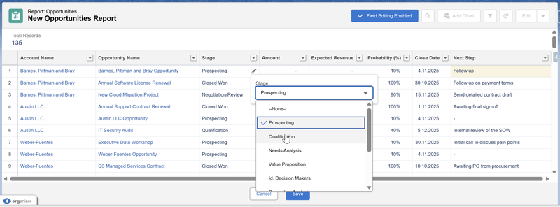 Example in Practice: You're reviewing a report of open opportunities grouped by stage, and you notice several deals stuck in "Negotiation" stage for over 60 days. You can update their stages directly in the report while seeing the deal ages and values that inform your decision about which ones to move forward or close.