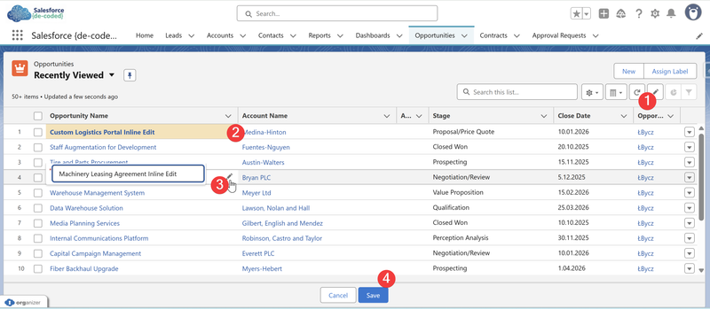 List views display records in table format, and many of these tables support inline editing. When you open a list view, you'll see a pencil icon appear when you hover over editable fields. Click the icon, make your change, and the field updates immediately.