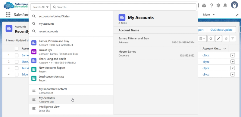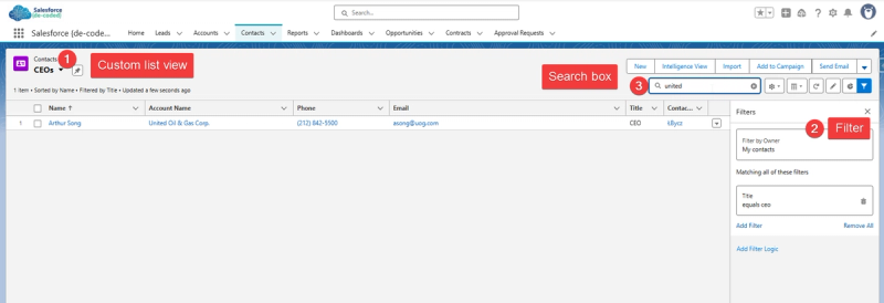 You can share custom list views with other users or groups. This sharing capability proves useful when your team needs to work from the same filtered perspective. A sales manager might create a view of accounts in their territory and share it with their team, ensuring everyone sees the same set of accounts.