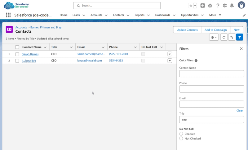 Most related lists include their own search capability. If an account has dozens of contacts and you need to find one specific person, you can search within just that account's contacts. This focused search narrows your scope automatically, making it faster than searching across all contacts in your database.