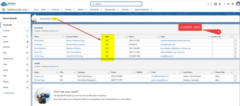 Global Search looks through various fields on each record type, not just the name. For an Account, it might search the company name, website, billing address, and other text fields. For Contacts, it examines names, email addresses, phone numbers, and titles. Your administrator determines which specific fields are searchable for each record type.