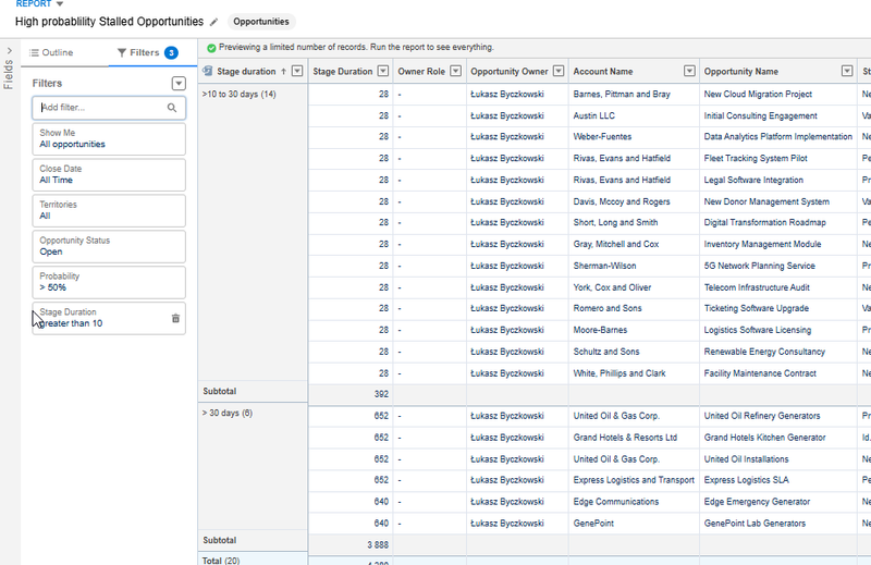 Opportunities with high probability (e.g., >50%) that have been sitting in their current sales stage for too long, based on the Stage Duration field.