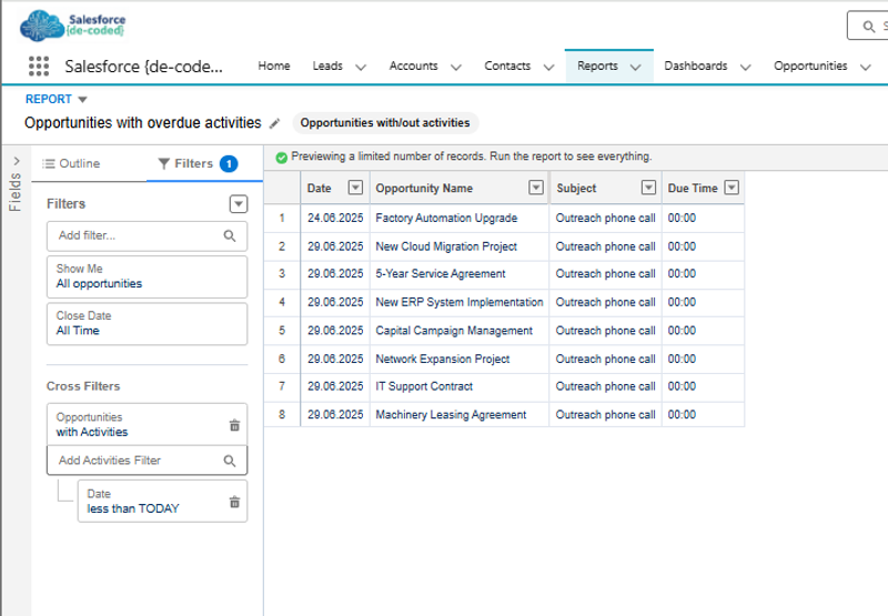 Why this is necessary: Salesforce's standard Opportunity reports can't reliably show opportunities WITHOUT activities. To do this, we need a custom report type that connects Opportunities to Activities using a special relationship that says "show me opportunities even if they have no activities."