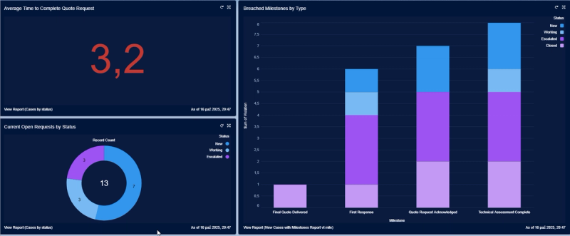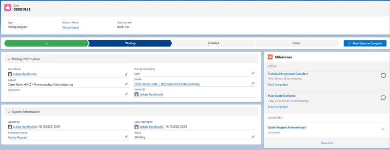 The entire process is tracked as a Case linked to the original Quote. This means all communication, documents, and timeline history stay connected to the deal. If Maria needs to reference why a quote took longer than expected, or if her manager wants to review the team's workload, everything is documented in one place.